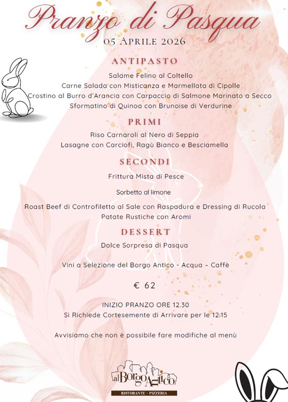Da noi potrai gustare i migliori piatti della cucina mediterranea, da sempre specializzati in piatti a base pesce fresco; selezioniamo i migliori tagli di carni; le pizze sono fatte con materie prime di qualità, l'impasto è lavorato con lievito madre, così come il pane che sforniamo tutti i giorni e i dolci sono di nostra produzione. Al Borgo Antico abbiamo a disposizione circa 180 posti a sedere disposti in diverse sale: saletta per compleanni e cene aziendali, sala per il menù alla carta e un ampio salone per banchetti, cerimonie e pizzate.